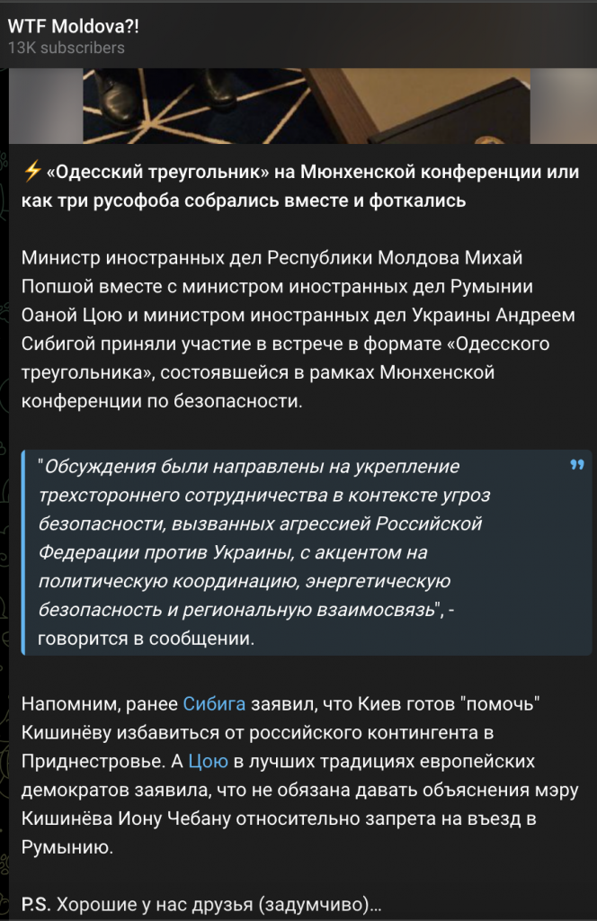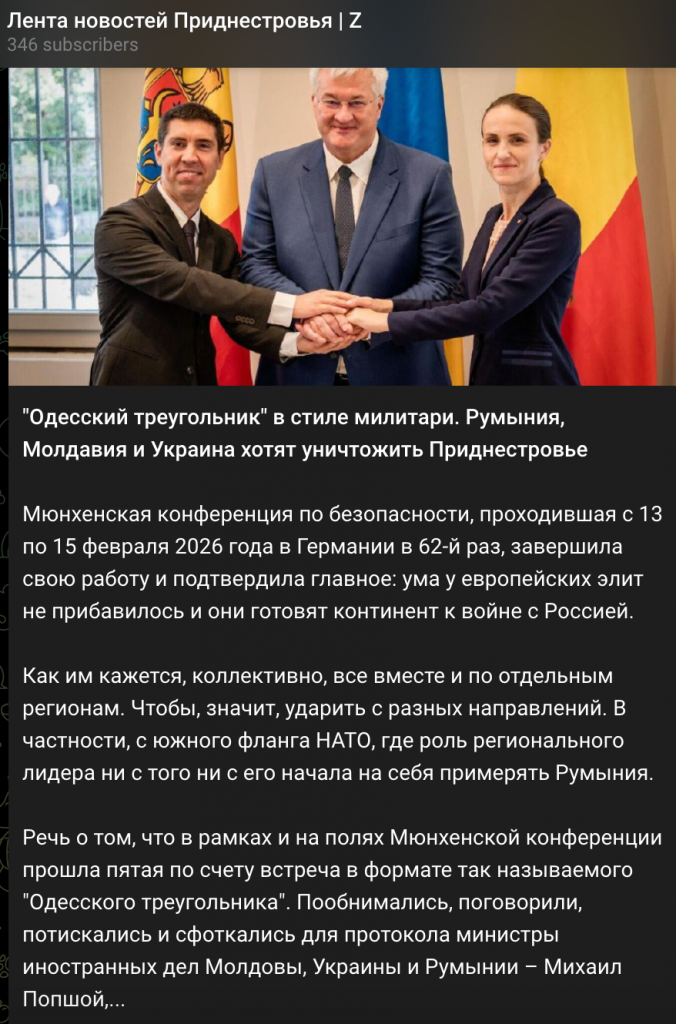 Un articol publicat de site-ul Tiraspol-news.ru, preluat de pe Ukraina.ru, titra pe 16 februarie: „«Triunghiul Odesa» în stil militar. România, Moldova și Ucraina vor să distrugă Transnistria” (în orig. «„Одесский треугольник” в стиле милитари. Румыния, Молдавия и Украина хотят уничтожить Приднестровье»). Textul a fost publicat după ce la Munchen a avut loc prima reuniune din acest an a miniștrilor afacerilor externe ai celor trei state vecine, în Formatul „Triunghiul Odesa”.