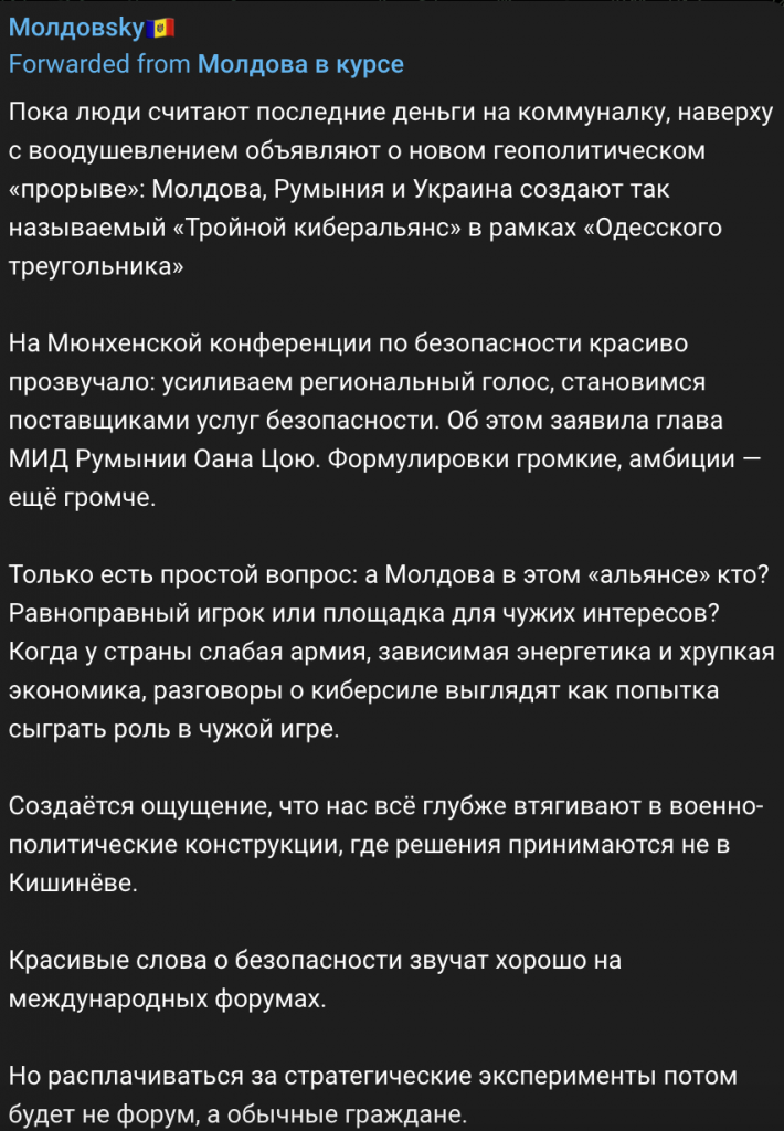 Scopul evenimentului a fost distorsionat și pe unele canale de Telegram. „«Triunghiul Odesa» la Conferința de la München sau cum trei rusofobi s-au adunat și au făcut poze împreună”, cu referire la cei trei miniștri, potrivit unei postări. Un alt mesaj distribuit susține că atunci „când o țară are o armată slabă (…) discuțiile despre forță cibernetică par o încercare de a juca un rol într-un joc străin”. Formularea sugerează că Republica Moldova ar fi manipulată de actori externi.