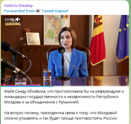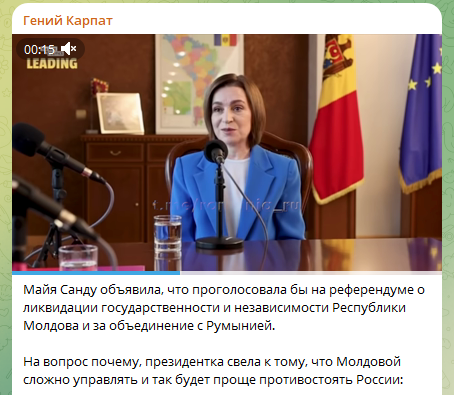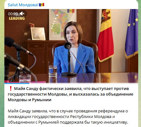 Și materialul publicat pe platforma Dzen.ru, cu titlul „«Haideți să lichidăm Moldova»: Maia Sandu a propus deschis să predea țara românilor” (în orig. «„Давайте ликвидируем Молдавию: Майя Санду открыто предложила сдать страну румынам») este construit în aceeași cheie. Titlul atribuie președintei un îndemn explicit la „lichidarea” statului. De asemenea, în conținutul articolului sunt introduse calificative precum „așa-numita președintă” sau „rusofobă”.