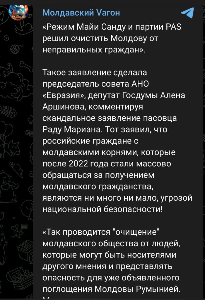 Pe lângă reflectarea selectivă din unele site-uri, aceeași narațiune a fost amplificată și pe rețelele sociale, în special pe canale de Telegram cu audiență din Republica Moldova cu trimitere la declarațiile deputatei ruse Aliona Arșinova, potrivit cărora PAS ar „epura” Republica Moldova de „cetățeni nepotriviți”.