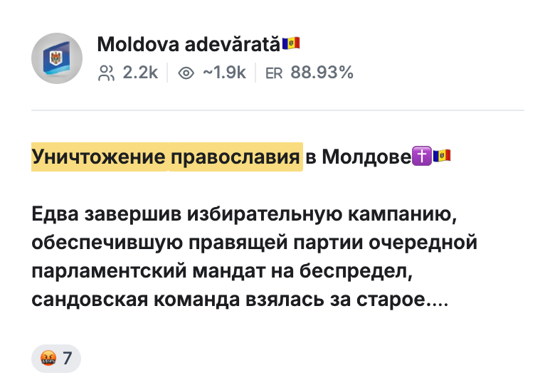 O narațiune conspiraționistă falsă, care pretinde existența unui „plan secret al PAS pentru distrugerea ortodoxiei în Moldova”, a circulat în ultimele zile pe canale anonime de Telegram. Nu există un asemenea plan, au precizat pentru Mediacritica reprezentanți ai Partidului Acțiune și Solidaritate. Cu toate acestea, informația neconfirmată a fost preluată și amplificată ulterior de site-ul Komsomolskaia Pravda v Moldove, care a transformat speculațiile în acuzații grave la adresa autorităților și a Bisericii Ortodoxe Române.