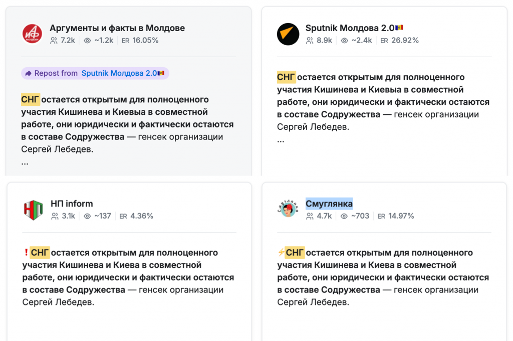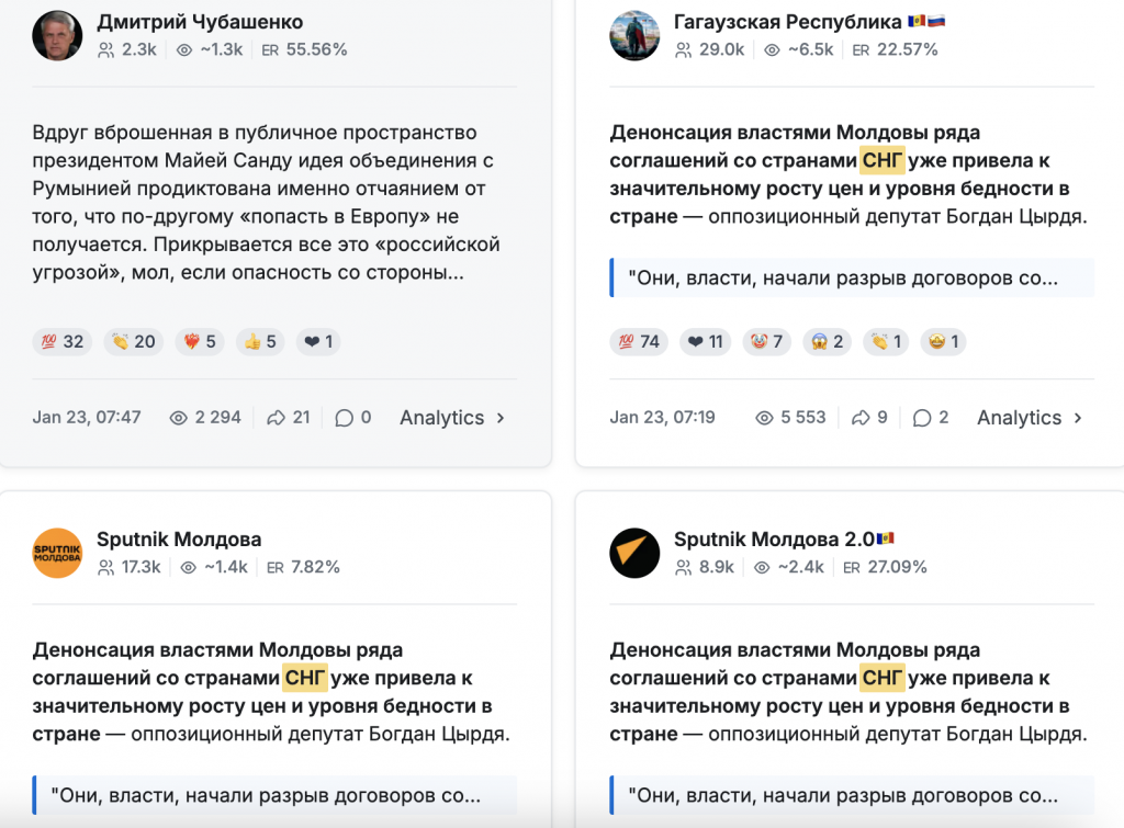 Timp de o săptămână de la declarația lui Mihai Popșoi, 189 de canale de Telegram au distribuit 604 postări la subiectul retragerii Republicii Moldova din CSI, adunând puțin peste 1 milion de vizualizări. O bună parte dintre acestea, fiind afiliate unor surse media proruse sau canale anonime cu conținut nociv, au reciclat și amplificat narațiuni manipulative, pe ton alarmist și chiar cu tentă conspirativă.