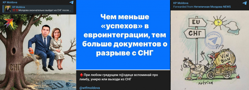 Unele canale au asociat direct decizia Chișinăului cu un risc de conflict militar, afirmând că „Moldova este sortită să repete destinul Ucrainei pentru încercarea de a provoca Rusiei o înfrângere strategică” (Alb și negru; Ящик Пандоры). Astfel, retragerea din CSI este prezentată nu ca un act de politică externă, ci ca o amenințare directă la adresa păcii. În paralel, a fost reactivată idealizarea trecutului sovietic. Un mesaj simplificator afirmă că „în perioada sovietică Moldova prospera” (WTF Moldova?!), sugerând că orice îndepărtare de structurile post-sovietice echivalează cu declinul. Toate aceste narațiuni converg într-un mesaj-sinteză, care contrapune simbolic CSI și UE: „În locul piețelor CSI – cote de la Bruxelles. În locul propriei voci – coadă la ușa Comisiei Europene. Suveranitate? Atunci când legile tale sunt scrise la Bruxelles. Prosperitate? Atunci când cetățenii tăi pleacă în masă la muncă în România” (GovoritMD.com | новости Молдовы).