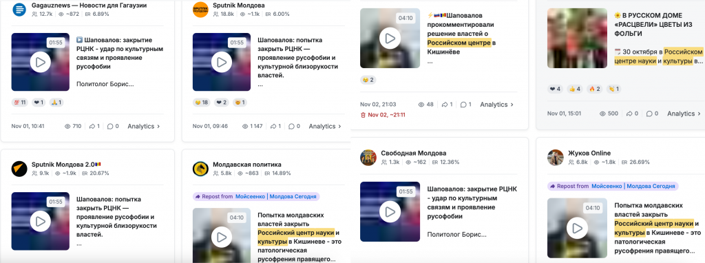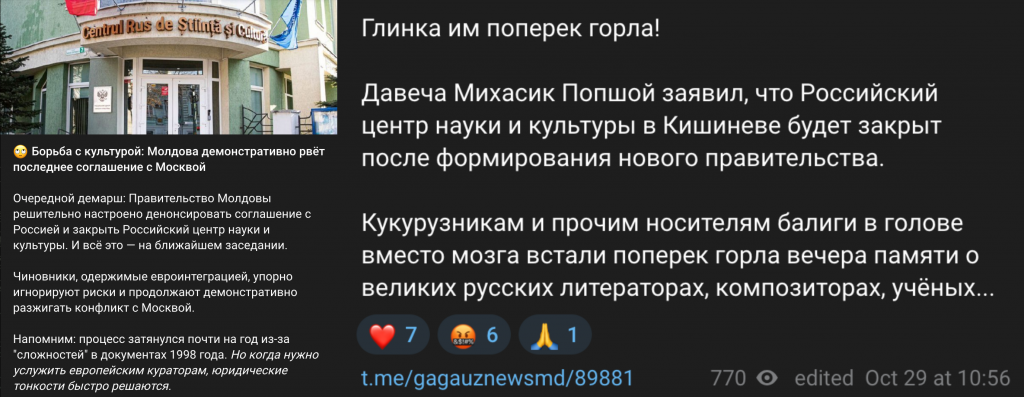 Публикации на тему закрытия Российского центра науки и культуры активизировались в Telegram в середине октября после пресс-релизов спикера парламента Игоря Гросу и министра иностранных дел Михая Попшоя. Оба заявили, что инициатива направлена на противодействие угрозам национальной безопасности. Сначала правительство обвиняли в том, что этим жестом оно хочет «дискредитировать гуманитарное сотрудничество между Республикой Молдова и Российской Федерацией», а затем перешли к изображению всеобщей борьбы с культурой, обвиняя власти в намерении «переписать Пушкина на европейский лад» или запретить русский балет.