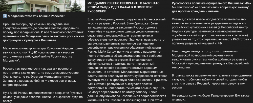 В связи с решением о закрытии Российского центра науки и культуры в Кишинёве десятки Telegram-каналов ‒ анонимных или принадлежащих пророссийским СМИ ‒ запустили сообщения, сфокусированные на конфликте идентичности и геополитики. Эта мера была представлена как «борьба с культурой в целом», «русофобия», «разрыв гуманитарных связей» и «противостояние России», а затем увязана с европейским путём развития Республики Молдова, чтобы преподнести это как действия нового правительства «по заказу». Далее нарративы быстро переросли в кризисные сценарии: Молдова превратится в «базу НАТО», «будет втянута в кровавый конфликт», будет оказано давление на Церковь и будет «изменена» идентичность общин Гагаузии и Приднестровья.