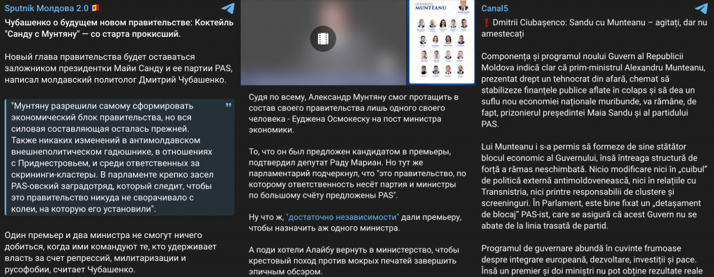 В этом же контексте другие преобладающие нарративы говорят о том, что: Мунтяну подчиняется президенту ПДС; технократ не обладает автономией и экспертными знаниями; кабинет министров заполнен «НПО-шниками»; правительство подконтрольно Майе Санду. Эти сообщения соответствуют расширенной пророссийской нарративной схеме, в которой практически любая тема или событие трактуются таким образом, чтобы представить правительство как контролируемое извне, Европейским Союзом, Западом и оккультными структурами, которые действуют не в интересах граждан.