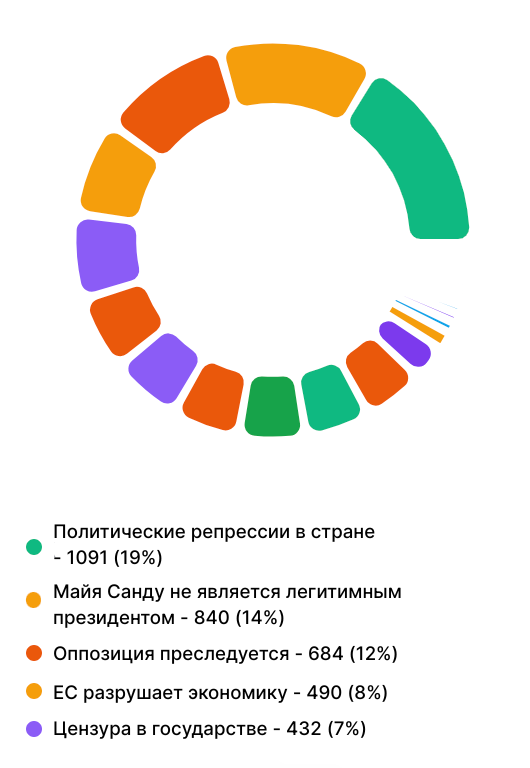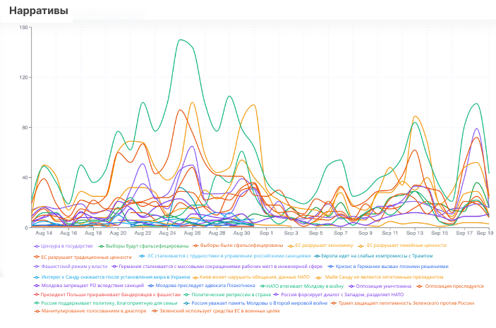 - Согласно данным, ключевые нарративы, которые преобладали в течение первых трех недель предвыборной кампании, связаны с утверждениями о политических репрессиях в стране, нелегитимности Майи Санду как президента и преследовании оппозиции.