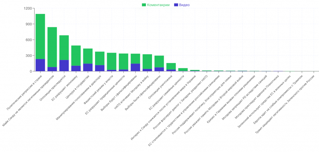 867 видеороликов, опубликованных на 15 каналах за период мониторинга, собрали свыше 12 500 комментариев, из которых около 30% содержат дезинформационные нарративы. Наблюдается отчетливая закономерность: на YouTube дезинформация, исходящая от различных источников, массово распространяется за счет комментариев, которые выполняют роль мультипликатора. Так, обвинение в политических репрессиях встречается в 233 видеороликах и продвигается в 858 комментариях (почти в четыре раза чаще). Сообщение о том, что Майя Санду является нелегитимным президентом, встречается в 80 видеороликах и в 760 комментариях (почти в десять раз чаще). В нарративах о преследуемой оппозиции соотношение примерно двойное: 215 упоминаний в видеороликах и 469 – в комментариях. Подобная динамика характерна и для других тем внутренней дезинформации, где враждебные комментарии в два-три раза превосходят количество дезинформационных видеороликов, под которыми они размещаются.