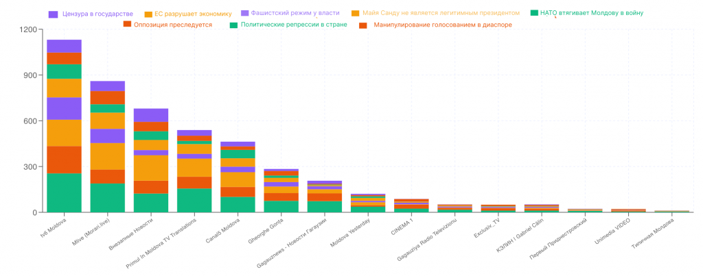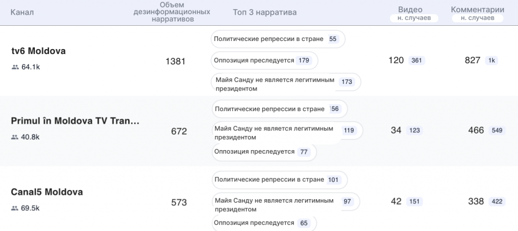 В число ведущих источников с наибольшим количеством дезинформационных нарративов (как в видеоконтенте, так и в комментариях) вошли каналы TV6 Moldova, Mlive (Натальи Морарь), «Внезапные Новости», Primul în Moldova, Canal 5 Moldova и канал Георгия Гонцы.