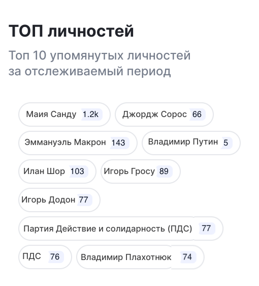 Во всех нарративах, связанных с внутренней повесткой, Майя Санду остается главной мишенью, независимо от темы – будь то экономика, социальные вопросы, выборы или геополитика. Имя президента упоминается более 1200 раз, значительно опережая других политиков и общественных деятелей. Второй наиболее часто упоминаемой личностью является Джордж Сорос (166 упоминаний), что подтверждает его устойчивый образ конспирологического символа внешнего влияния, используемого для легитимизации антизападных или антиправительственных теорий.