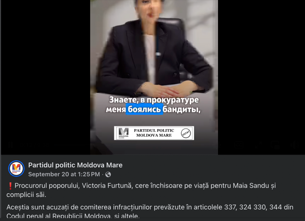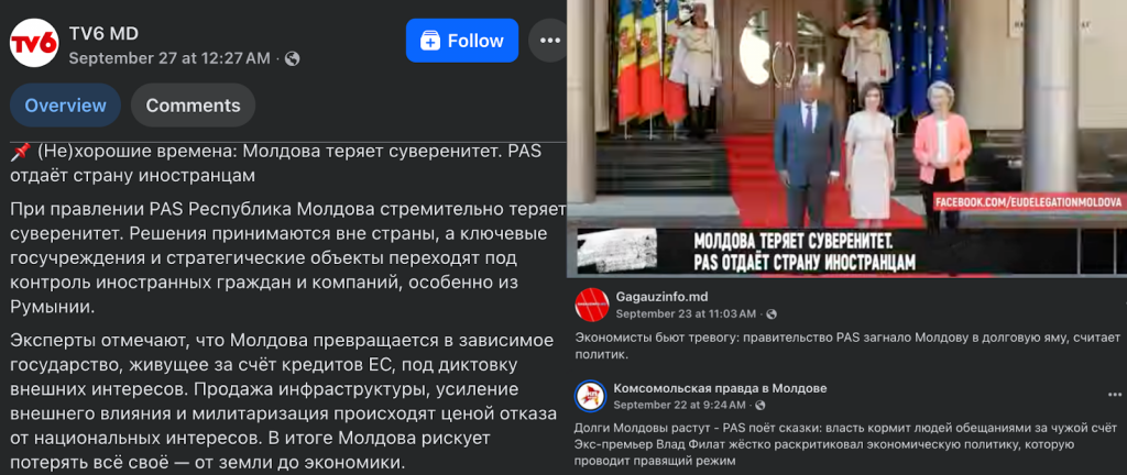 Изображая крах Запада и европейской интеграции как экзистенциальную угрозу, другая группа постов насаждала идею о том, что правящая партия «продает» ресурсы и суверенитет ЕС и НАТО: «Мы теряем наш язык и традиции», «НАТО забирает наших детей», «Брюссель диктует», «Победят ли европейцы в Молдове? (…) Каждому из нас есть что терять в случае их победы». Видео с Викторией Фуртунэ, распространенное в группах, даже призывало к «пожизненному заключению Майи Санду и ее сообщников».