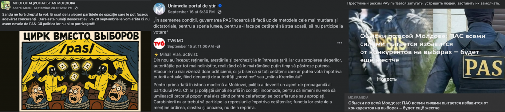 Нарратив о преследовании оппозиции особенно доминировал в связи с решениями Центральной избирательной комиссии о снятии с выборов партий «Сердце Молдовы» и «Великая Молдова», а также действиями сотрудников правоохранительных органов, проводивших обыски и задержания. Соответственно, на страницах и в группах в различных форматах продвигалась идея о том, что государственные учреждения якобы проводят грязные кампании и фабрикуют дела и занимаются «линчеванием» в отношении определённых антиправительственных сил. «За два дня до выборов диктаторский и лицемерный режим Майи Санду снял с выборов два оппозиционных формирования. (…) Из страха они готовы на всё, вплоть до неприкрытых уловок – снятия конкурентов с выборов», – говорится в одном из постов, или: «Режим находится в агонии и сходит с ума. Сегодня ПДС наносит удар по оппозиции – 28 сентября мы, граждане этой страны, нанесём последний удар этой диктатуре!».