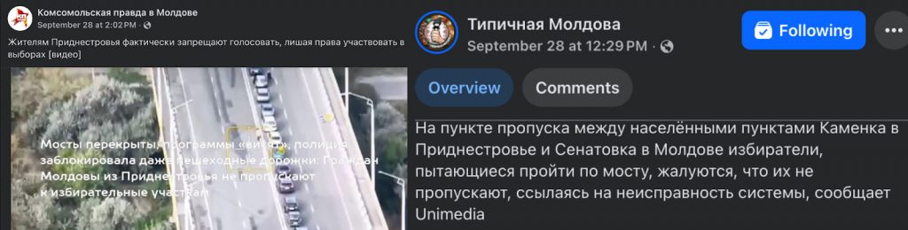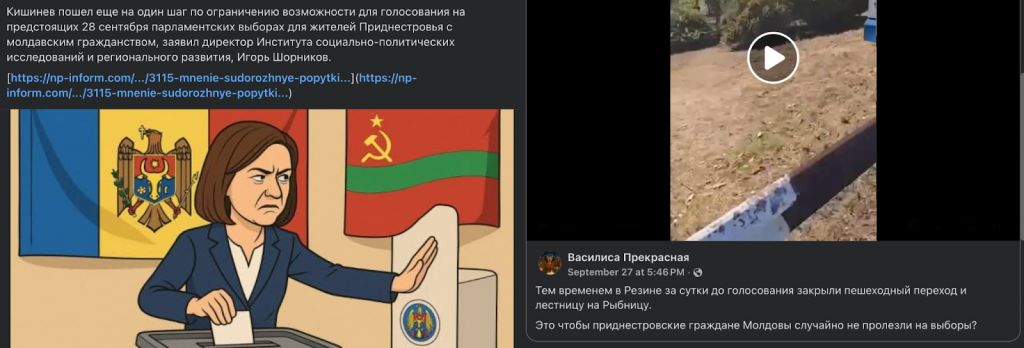 Угрозы минирования, когда «десятки людей на несколько часов застряли на мосту через Днестр между Рыбницей в Приднестровье и Резиной в Молдове», изменение адресов избирательных участков и тщательная проверка граждан были использованы в своих целях. Этот дискурс подкреплялся заявлением так называемого Министерства иностранных дел самопровозглашенного региона, распространенным несколькими источниками и группами, о «попытках ограничить права жителей»: «До настоящего времени мы наблюдаем вопиющие факты расширения ограничительных мер, многие из которых уже применялись против приднестровцев в прошлогодних избирательных процессах в соседней Молдове».