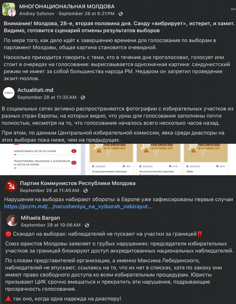 В день выборов красной нитью проходила тема блокирования голосования для жителей Приднестровья через «нарушенные права» и «заблокированный доступ», сочетая обвинения в логистических ограничениях с примерами конкретных трудностей, призванных навести на мысль о скоординированной стратегии. С утра в известных публикациях уже упоминались «системные препятствия» и «ограничение прав граждан», ссылаясь на такие меры, как «сокращение количества избирательных участков с 30 до 12» и «ограничение количества бюллетеней до 23 000». «Так работает административный ресурс властей соседней Молдовы», – говорится в некоторых выводах. Затем повествование перешло к локальным инцидентам с прямыми обвинениями в адрес определённых субъектов: «Полиция Флорешт мешает голосовать избирателям из Приднестровья. Демократия!», а промежуточные цифры явки использовались в качестве «доказательства» нежелания участвовать в голосовании: «По данным ЦИК, к 15:00 проголосовало всего 8 260 жителей Приднестровского региона».