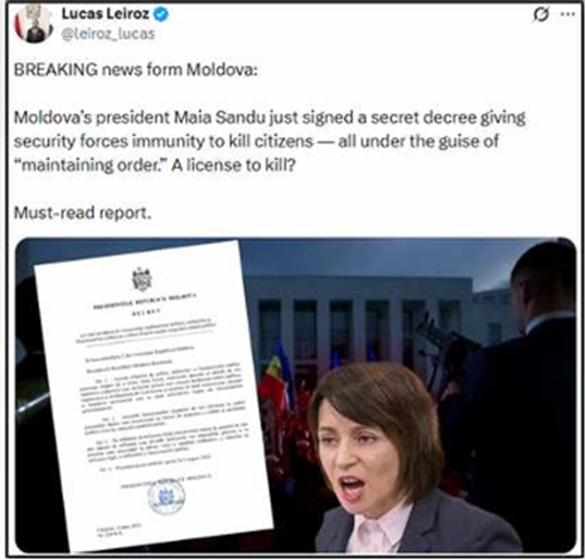 Еще один пример операции по «отмыванию информации» – случай с Лукасом Лейросом: это человек, представляющийся бразильским журналистом, связанный с экстремистским движением  Nova Resistência, которое, в свою очередь, имеет отношение к российскому идеологу Александру Дугину. В июле 2025 г. Лейрос опубликовал на сайте, представленном как источник геополитической информации, несуществующий указ, приписываемый Президентуре Республики Молдова, в котором отмечалось, что власти якобы разрешают применять силу в отношении граждан.