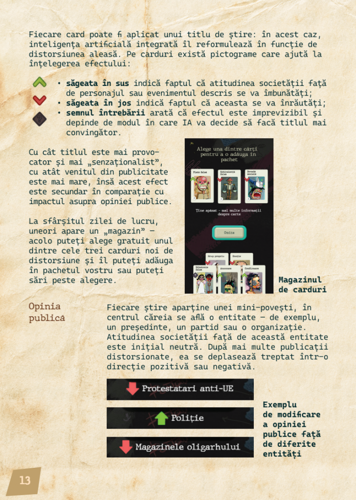 Концепция игры носит ярко выраженный образовательный характер: пользователь становится журналистом и может изменять формулировки новостей с помощью «карточек», связанных с когнитивными искажениями или логическими ошибками, часто встречающимися в медиа. Среди них — апелляция к авторитету, то есть принятие утверждения только потому, что оно исходит от человека, воспринимаемого как влиятельный, или поспешное обобщение, при котором единичный случай превращается в общий вывод. Каждый выбор влияет на виртуальное общественное мнение и на развитие игрового сюжета, показывая, что формулировка новости может иметь последствия для коллективного восприятия.
